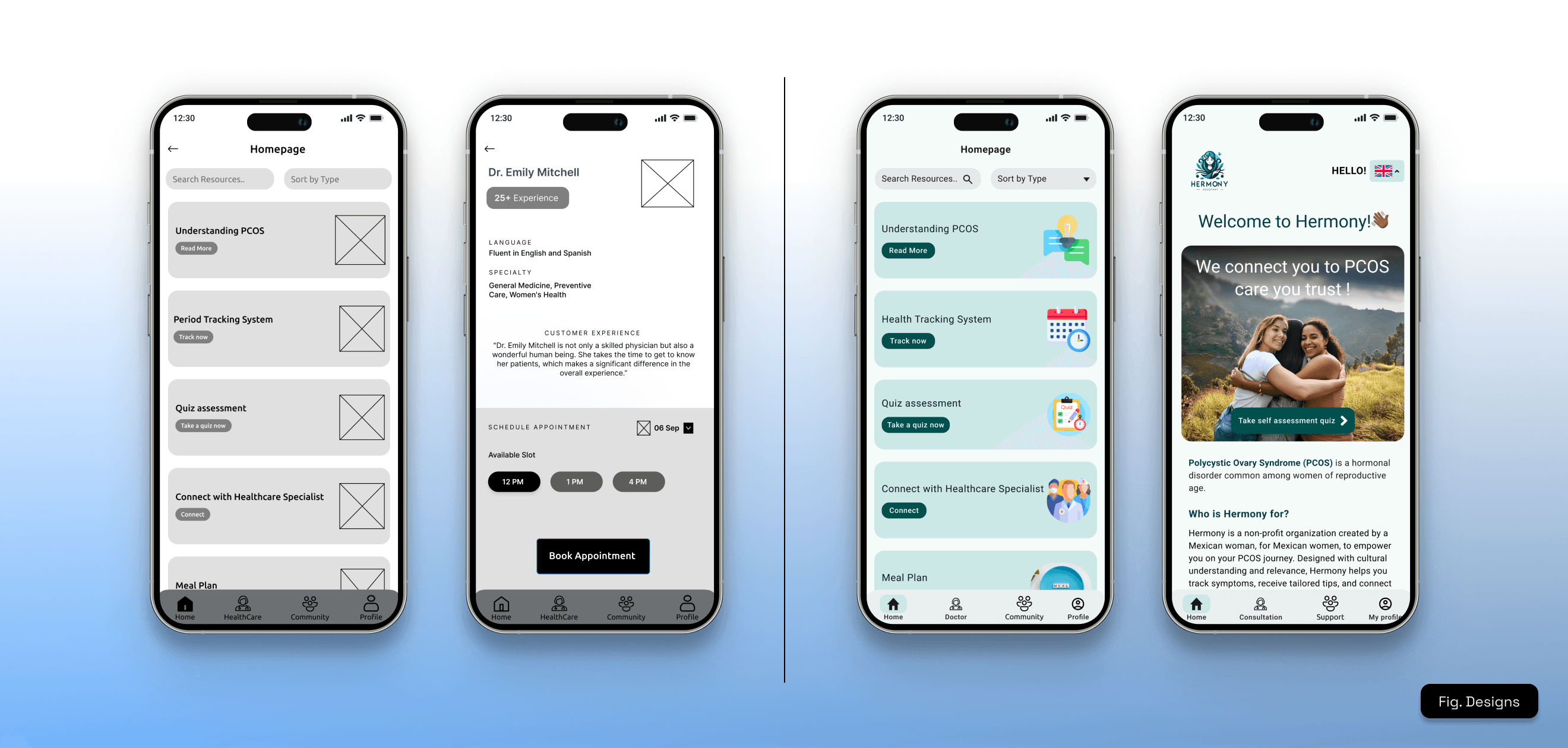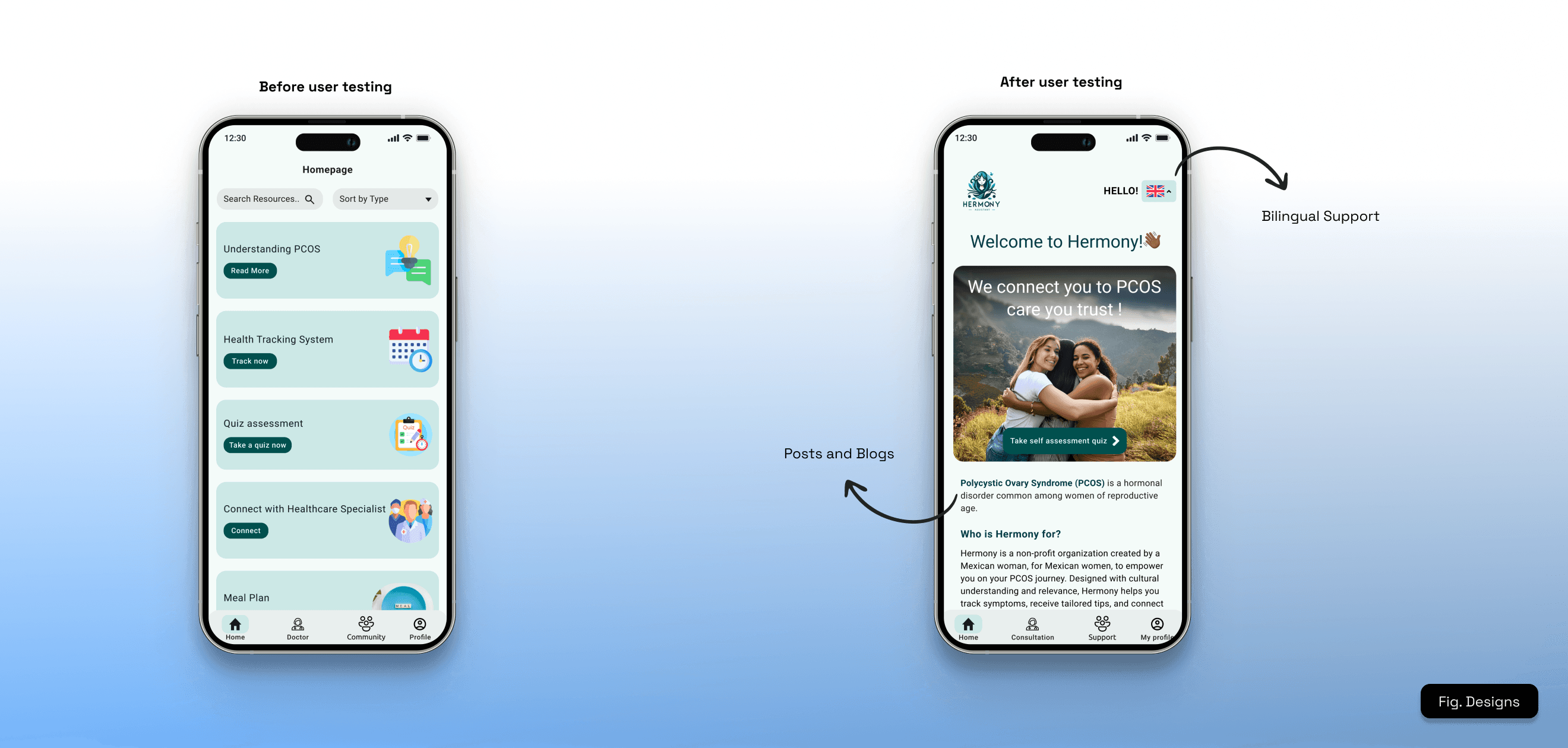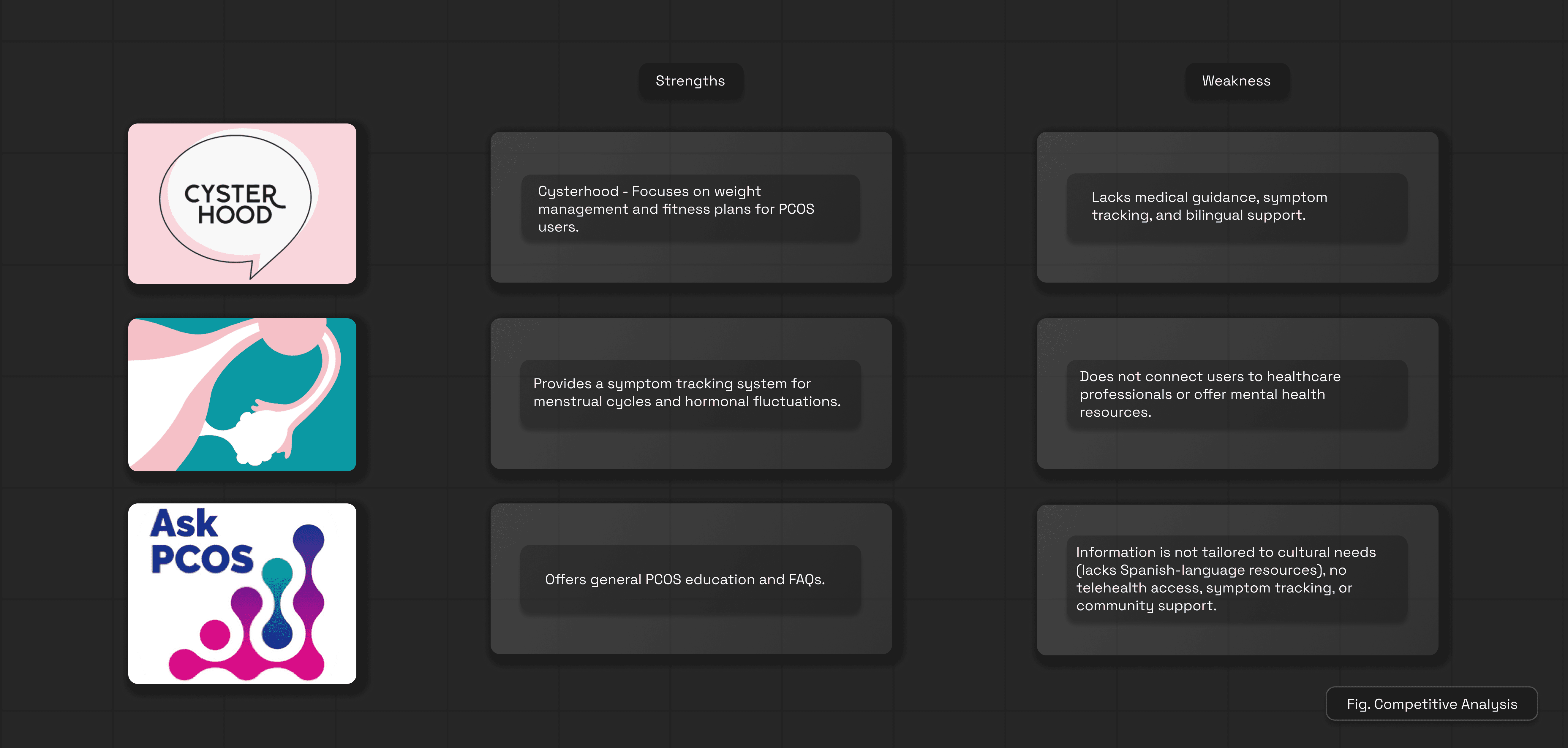 By looking at Cysterhood, PCOS Tracker, and learning more about PCOS, they all have some features like PCOS tracking, bilingual support, and resources, but each is missing something. From this, we got a clear idea—why not put everything in one place? This helped us shape Hermony into a user-centric, easy-to-use platform that actually works for Mexican women, making it more complete and accessible than the rest.