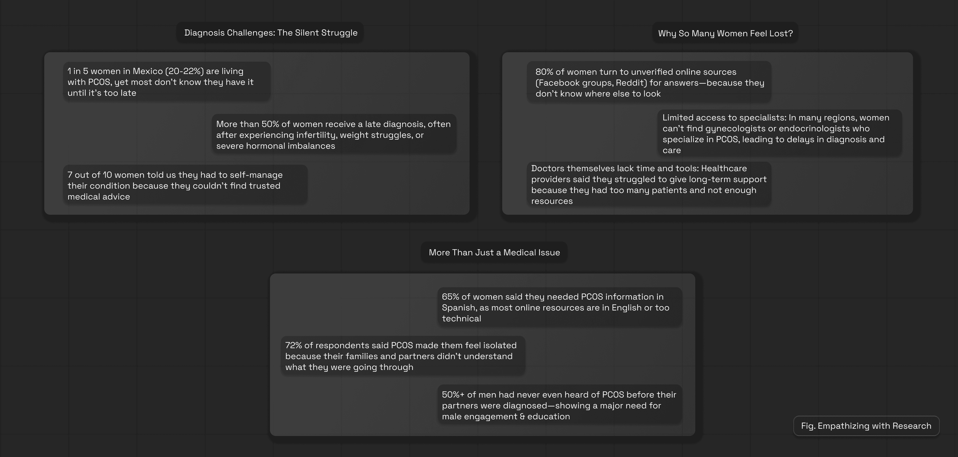 To truly understand the impact of PCOS on women in Mexico, we immersed ourselves in real user experiences, stories, and struggles. Our research wasn’t just about gathering numbers—it was about listening, learning, and feeling the weight of the challenges women face every day.
