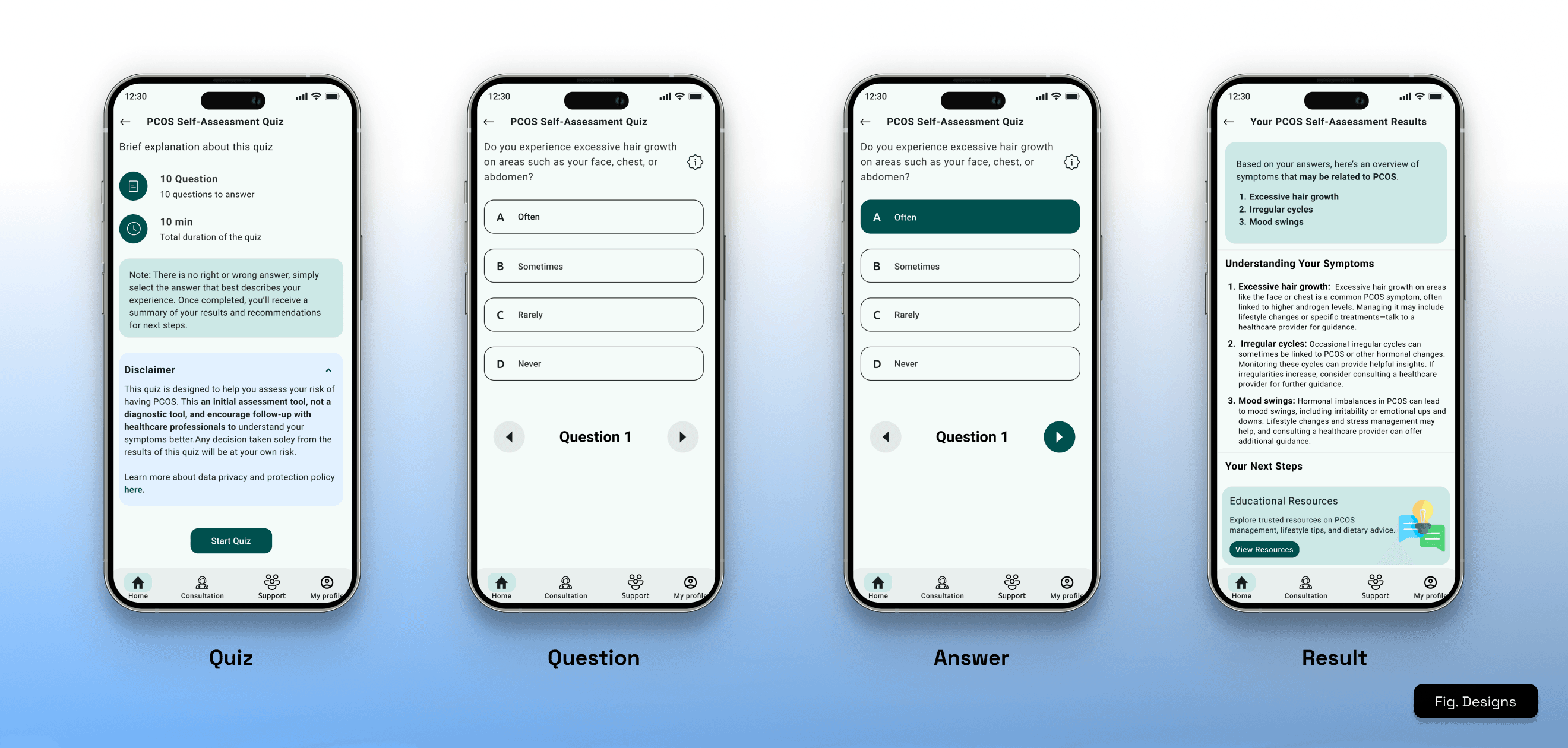 The quiz-based assessment helps users identify potential PCOS symptoms through guided questions and offers personalized recommendations. Designed with healthcare professionals, it supports early detection and encourages timely medical action.