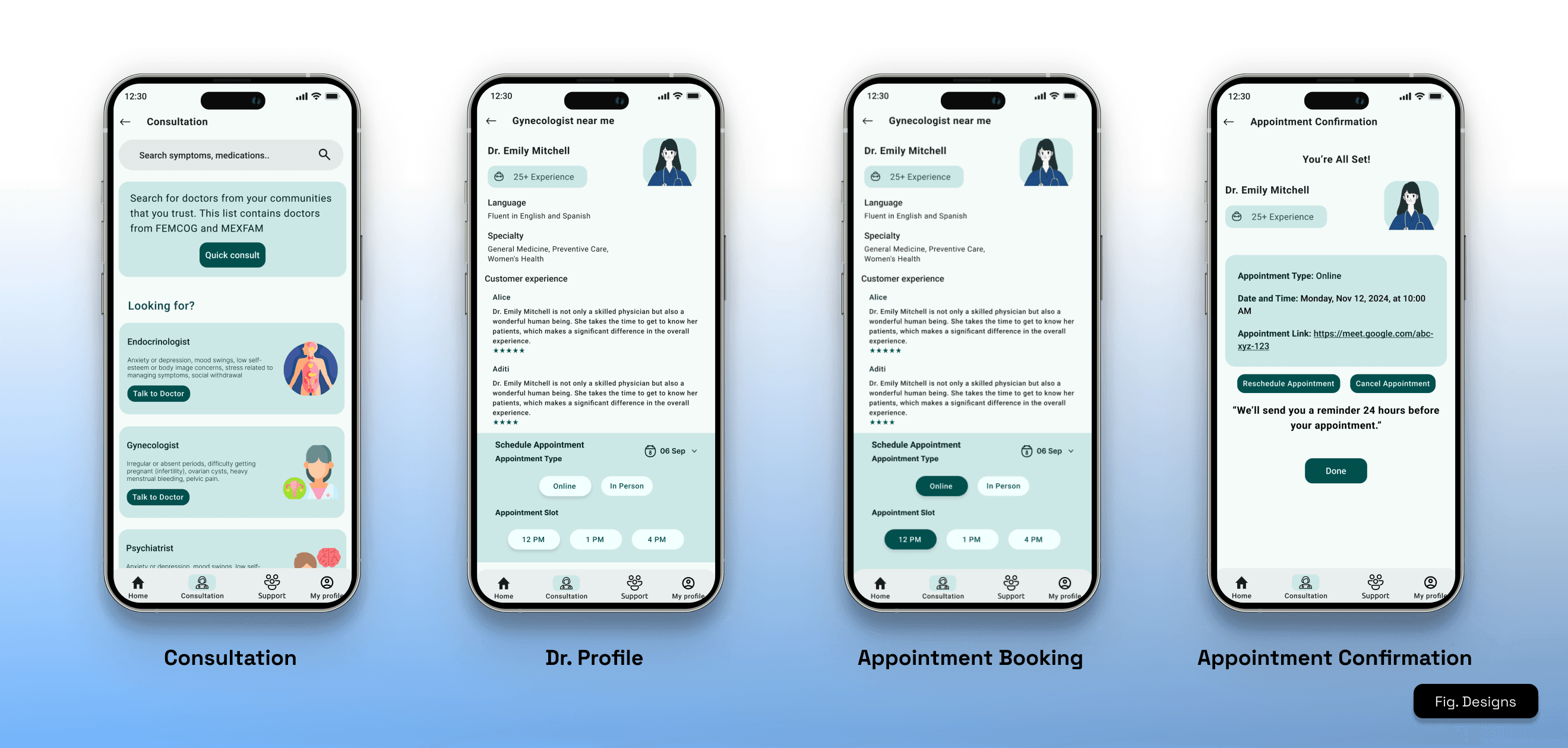 Hermony’s consultation feature allows users to book appointments with trusted gynecologists and endocrinologists—either in-person or online. With verified doctor profiles, reviews, and ratings, users can make informed choices and access personalized care, no matter where they are.