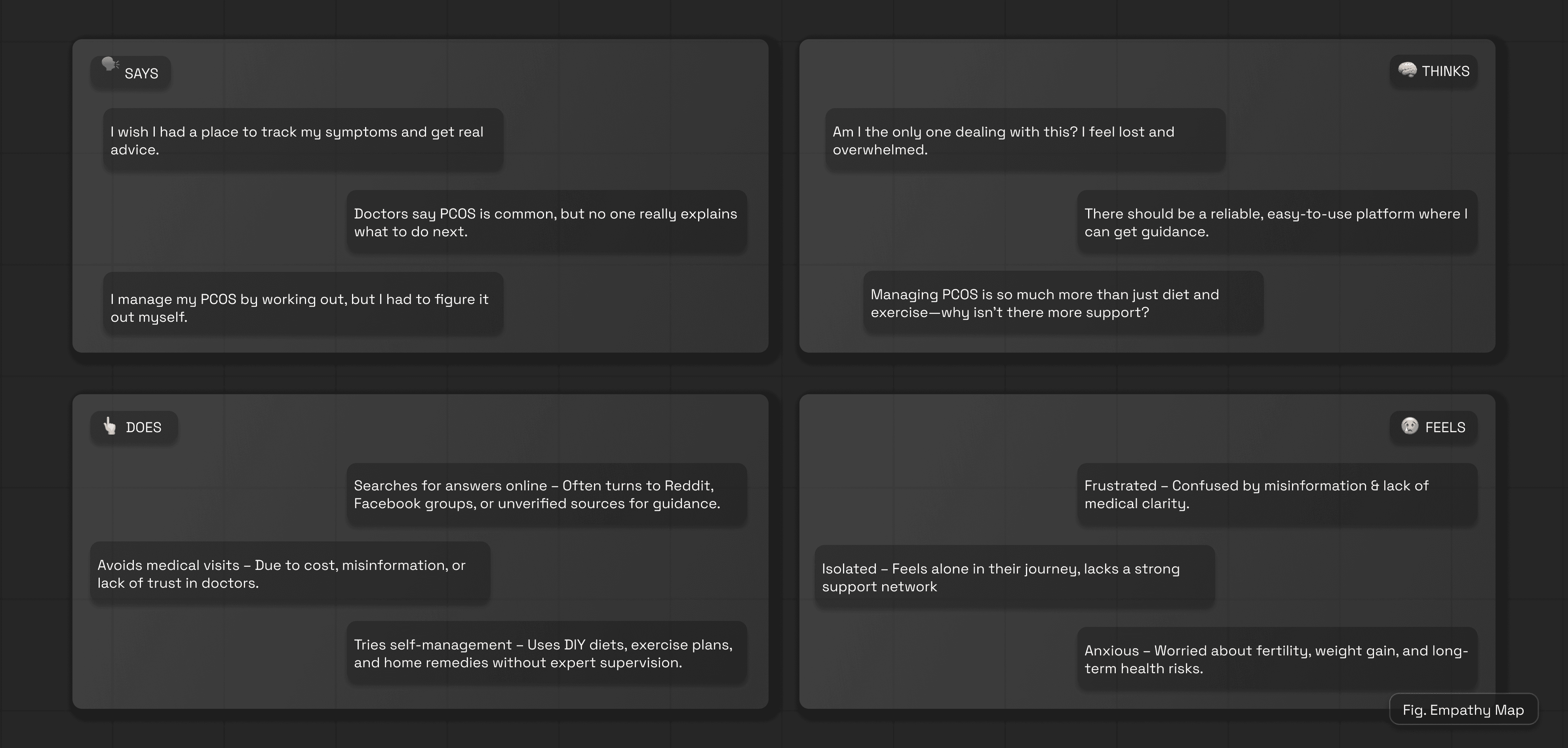 To build a solution that truly meets users' needs, we conducted 35+ interviews with Women with PCOS (Diagnosed & Undiagnosed), Healthcare Providers (Gynecologists & Endocrinologists), and male allies(family members). Through these interviews, we gained insights into how they track PCOS and what improvements are needed.