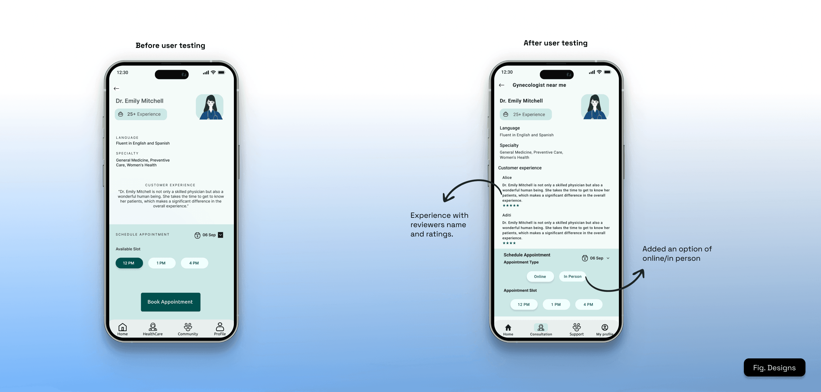 To improve accessibility, we added in-person and online appointment booking, making telehealth easier for remote users. We also introduced a review system with user names to build trust and allow patients to connect with others for shared healthcare experiences.