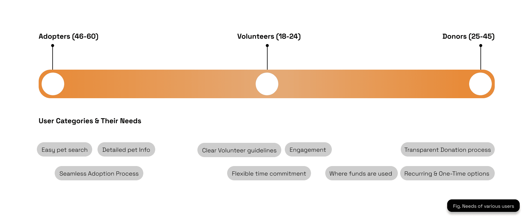 I interviewed 13 participants via surveys, interviews, and quick usability sessions. Their feedback revealed three main user categories—Adopters, Volunteers, and Donors. Each group shared unique needs, from detailed pet info and seamless adoption flows to transparent donation processes and flexible volunteer options.