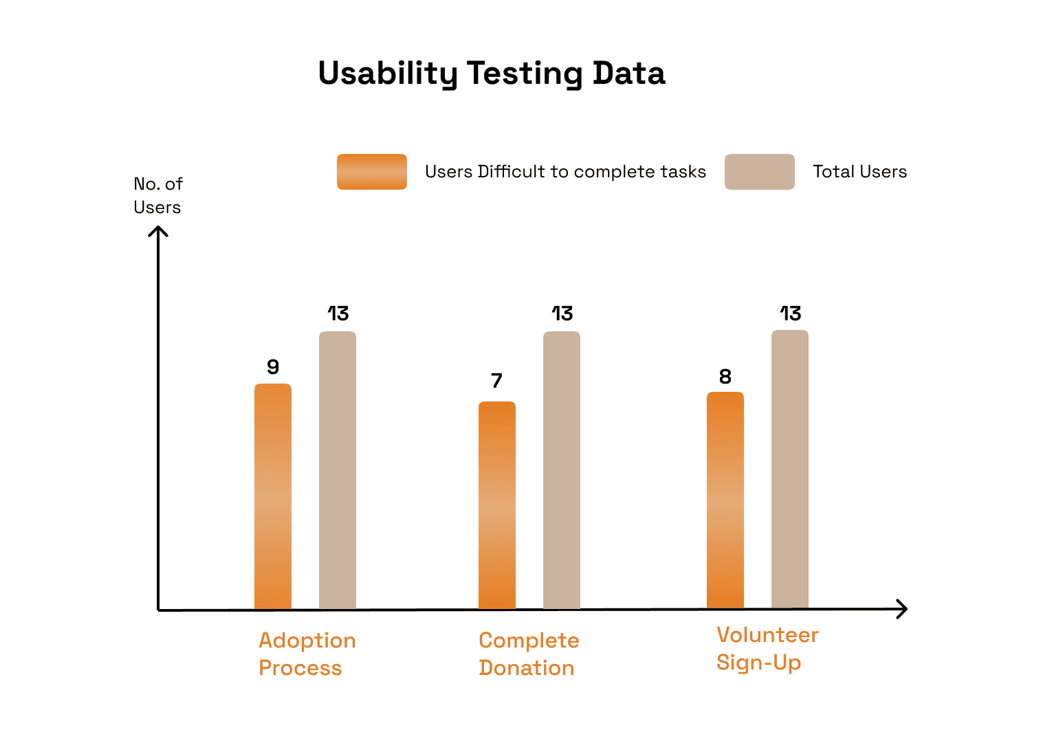 I tested three core user flows—Adoption, Donation, and Volunteer Sign-Up—with 13 participants. The orange bars in the chart show how many users had difficulty completing each task, while the beige bars represent the total number of participants.